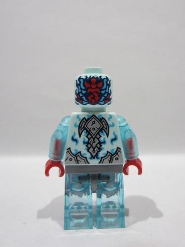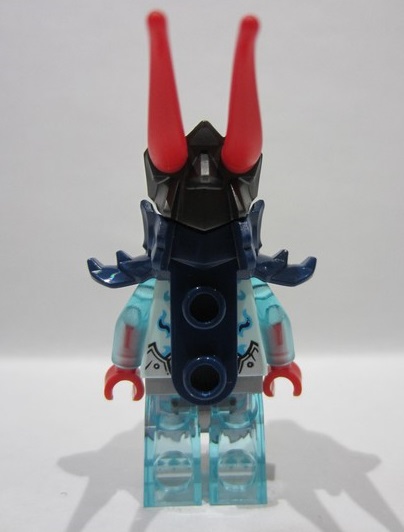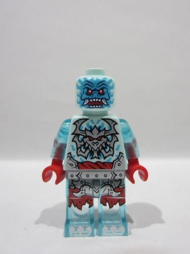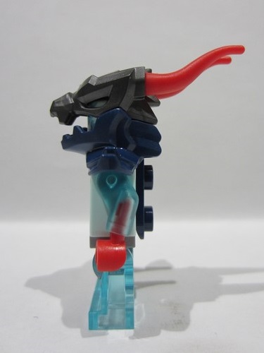 Light Aqua Minifigure, Head Alien Dragon with Medium Azure Face, Red Eyes, Dark Blue Eyebrows and Nostrils, Open Mouth with Fangs and Sharp Teeth, Scales and Swirls on Back Pattern