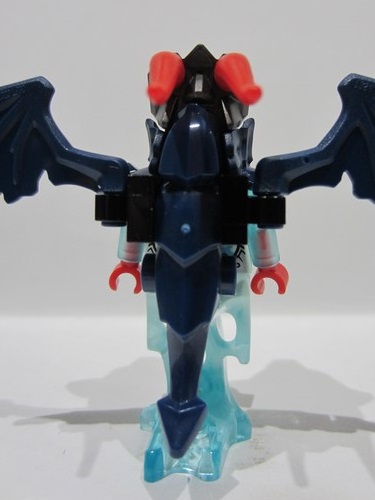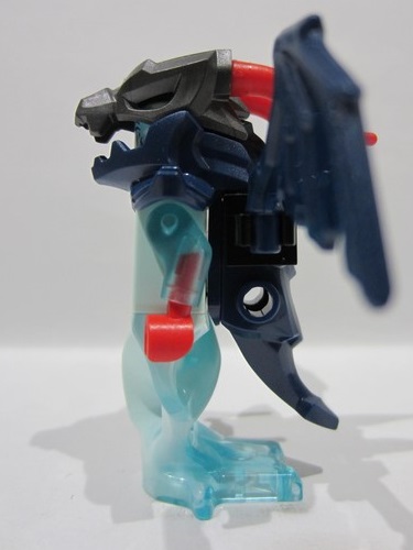 Light Aqua Minifigure, Head Alien Dragon with Medium Azure Face, Red Eyes, Dark Blue Eyebrows and Nostrils, Open Mouth with Fangs and Sharp Teeth, Scales and Swirls on Back Pattern