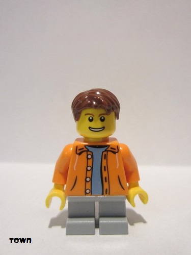 lego 2013 mini figurine cty0440 Citizen Orange Jacket with Hood over Light Blue Sweater, Light Bluish Gray Short Legs, Reddish Brown Short Tousled Hair