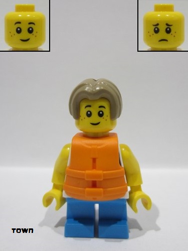 lego 2024 mini figurine cty1792 Boy Dark Tan Bowl Cut, Orange Life Vest, Dark Azure Short Legs