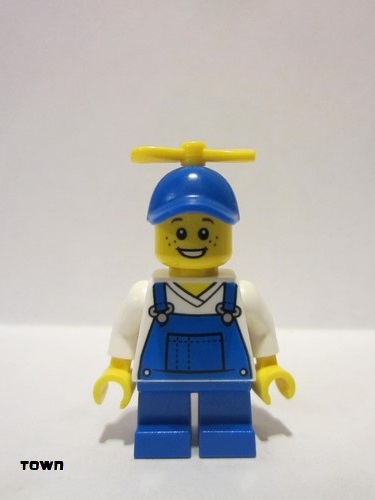 lego 2020 mini figurine cty1214 Boy Blue Overalls over V-Neck Shirt, Blue Short Legs, Blue Cap with Tiny Yellow Propeller